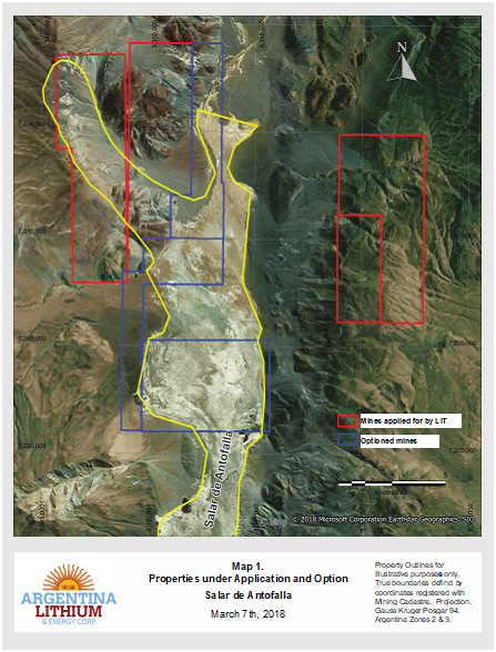 Argentina Lithium has applied for 100% interest in approximately 9,000 hectares of mining claims in the north end of the Salar de Antofalla (“Staked Properties”).Furthermore, the Company has entered into an option agreement to earn a 100% interest in three additional properties totaling over 5,300 hectares (“Optioned Properties”) situated adjacent to the Staked Properties.The Optioned Properties include two granted mine concessions and a third mine application. Terms of the option include cash payments totaling US$3,500,000 over 42 months, but limited to only $500,000 in the first 18 months.The option also includes annual exploration expenditure commitments of $500,000 in year one, followed by $1.5M in year two, $2.0M in year 3 and $3.0M in year 4.