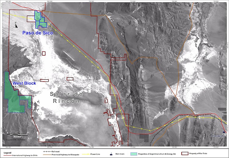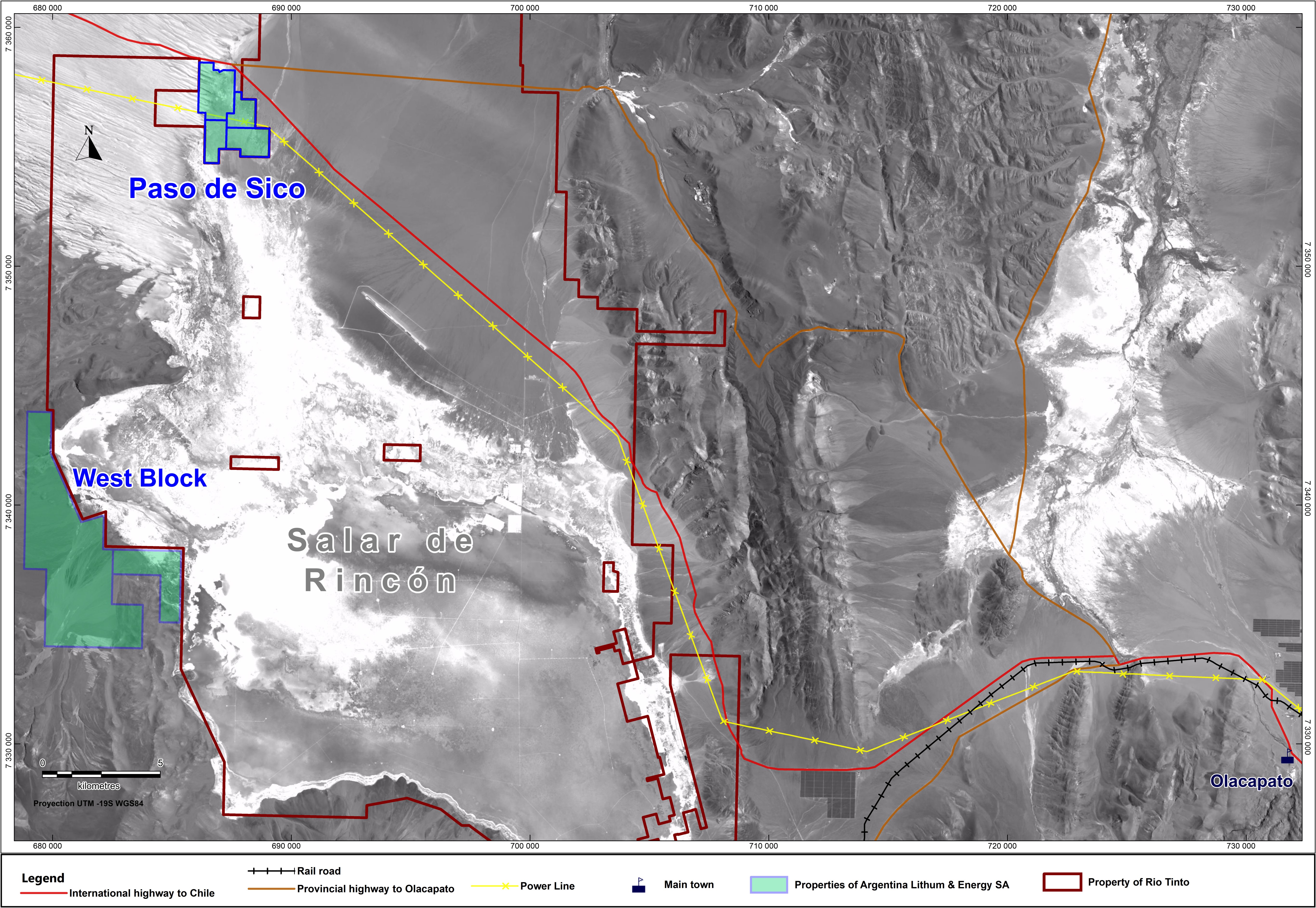 There are two significant lithium resource development projects on the salar, owned by Rio Tinto (www.riotinto.com) and Argosy Minerals (www.argosyminerals.com.au) both of which have executed demonstration-scale production of lithium carbonate. Rio Tinto plan to expand its production to 60,000 tonnes of battery grade lithium carbonate per year by 2028.[Argentina Lithium cautions that proximity to a discovery, mineral resource, or mining operation does not indicate that mineralization will occur on the Company’s property, and if mineralization does occur, that it will occur in sufficient quantity or grade that would result in an economic extraction scenario.] The Rincon West project is adjacent to claims belonging to Rio Tinto on the east, west and north sides of the salar.